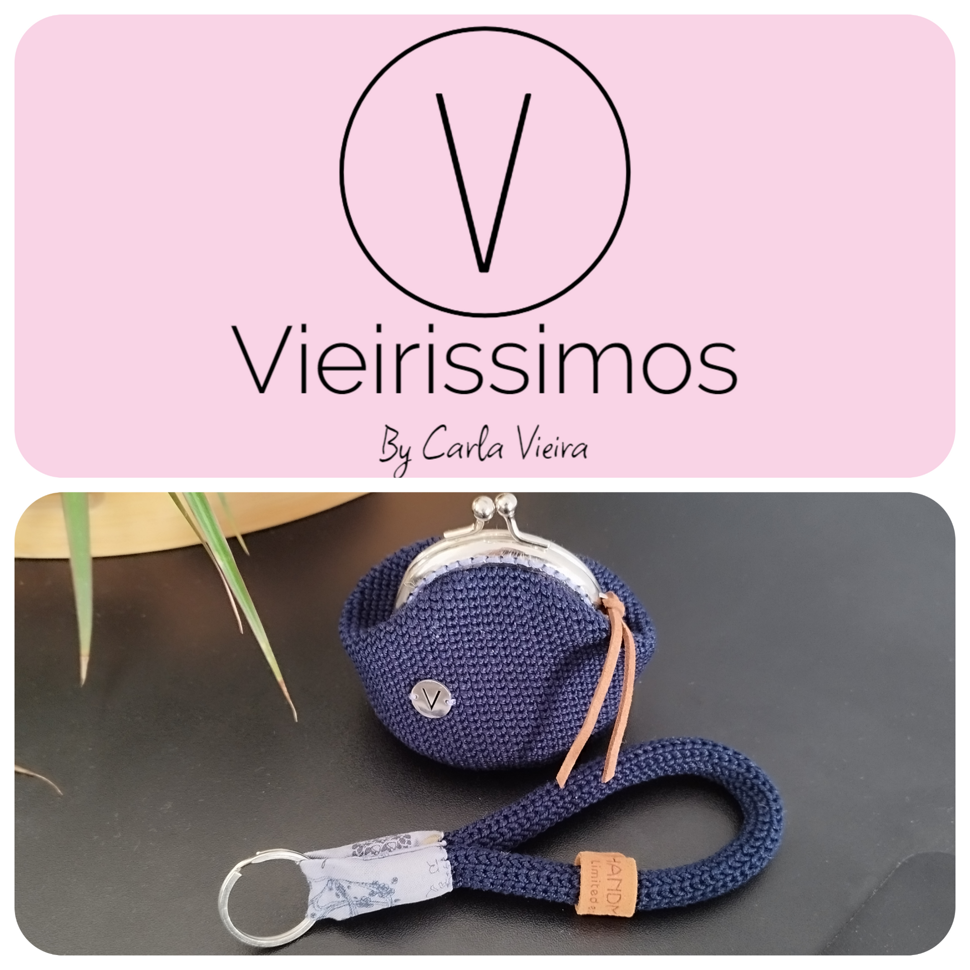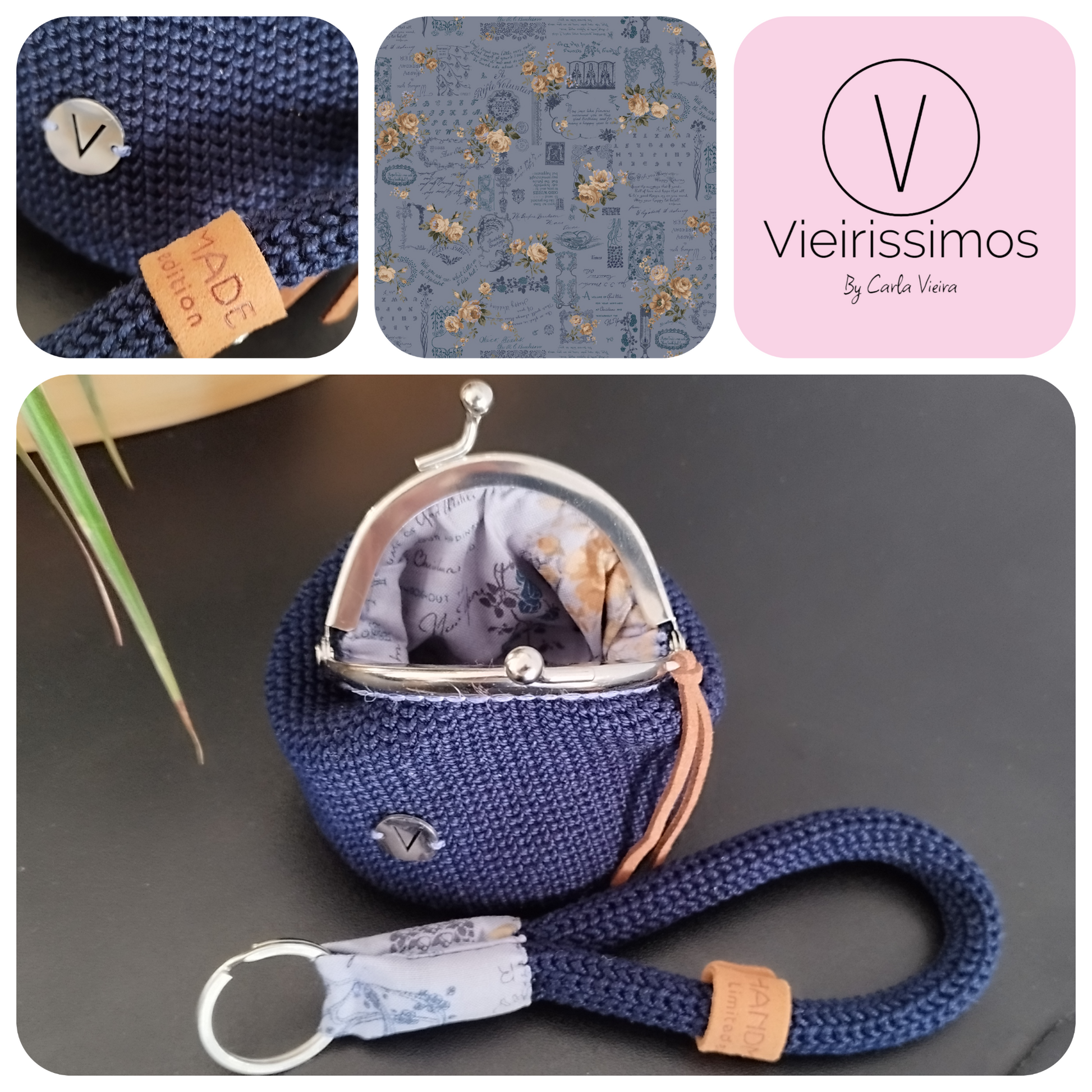 - Duo 'Old Rose Garden' Porta moedas pequeno com fecho metálico de 6,5cm e porta-chaves em crochê, forrado com tecido 100% Algodão. Cor: Azul Escuro