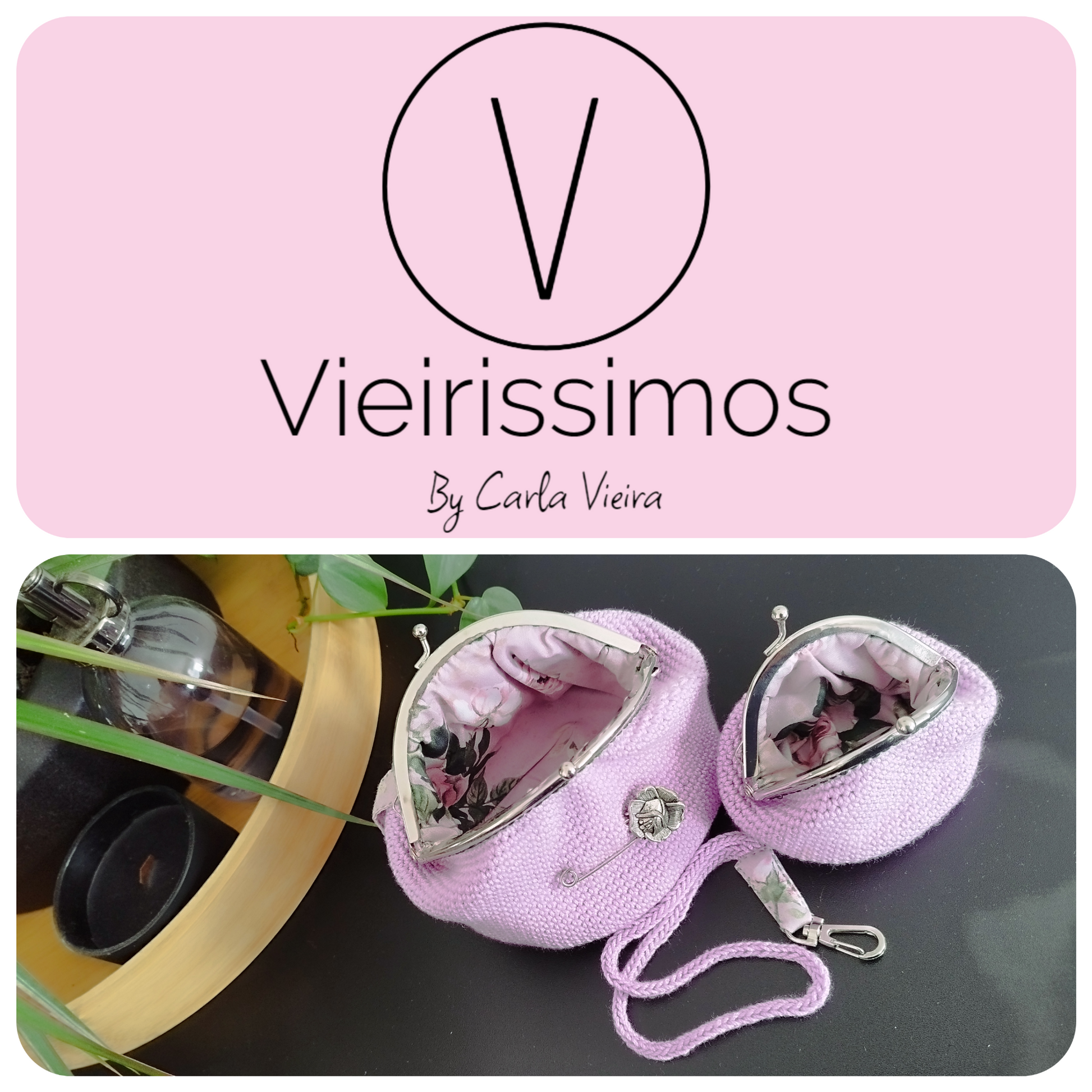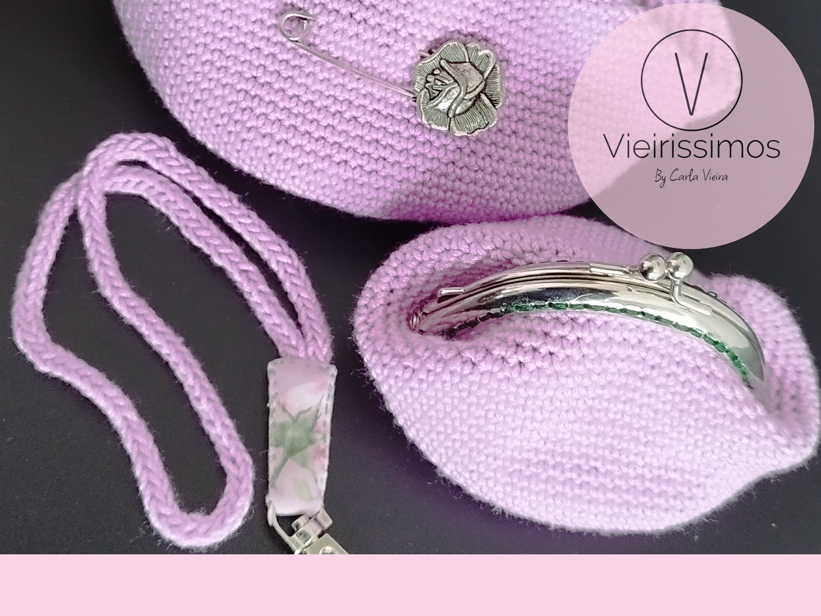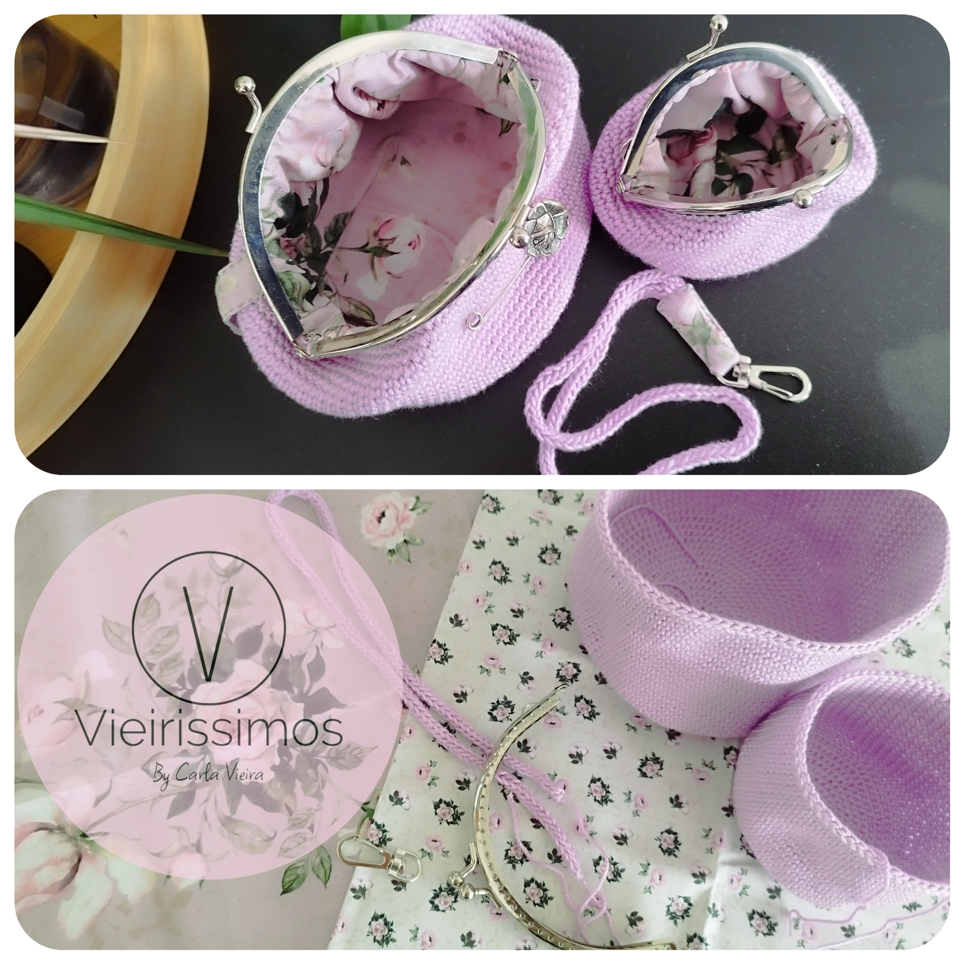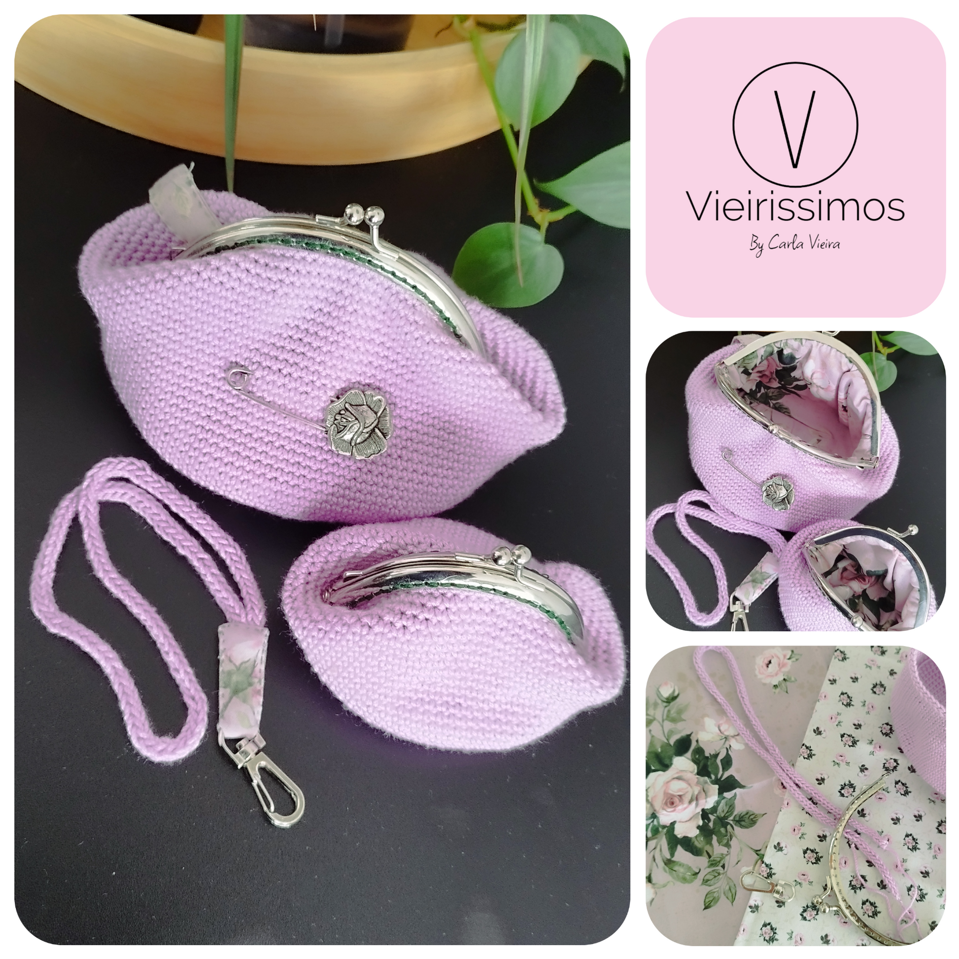 Conjunto composto por porta moedas médio, porta moedas pequeno e porta-chaves em crochet, forrado a tecido 100% algodão.